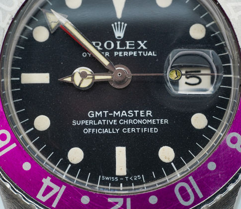 1968 Rolex GMT-Master 1675 FUSCIA INSERT Long “E” Stainless Steel Black Dial!