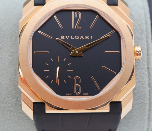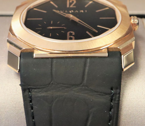 The 6.40mm thick Octo Finissimo automatic movement extra thin is a bond between jewelry savoir-faire and watchmaking art. You can view the beautiful BVL 138 Caliber through the exhibition caseback.