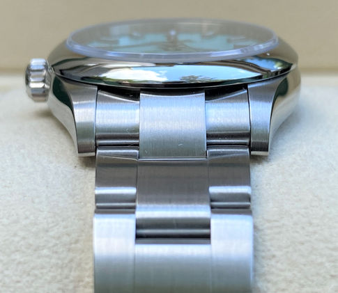This timepiece comes brand new. Comes with the outer white sleeve, outer cream box, and the inner green wave box, instruction manuals, warranty manuals, warranty card (Dated April 2022) and green and white serial hangtag. The watch was not sized at the time of purchase. It comes with the beautiful Turquoise blue (AKA Tiffany) dial. Mechanically the watch is functioning as it should. Serial numbers & names are blurred in photos only for privacy reasons.
